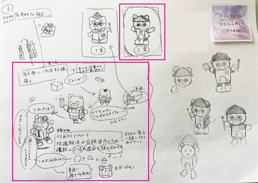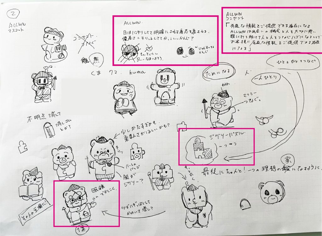 で、それをどうやってマスコットに落とし込むかを資料①で考えました!表情から考えたのですが、お客様の一生に一度のお買い物なので、しっかり考えている・賢い/安心感がある表情にしました!